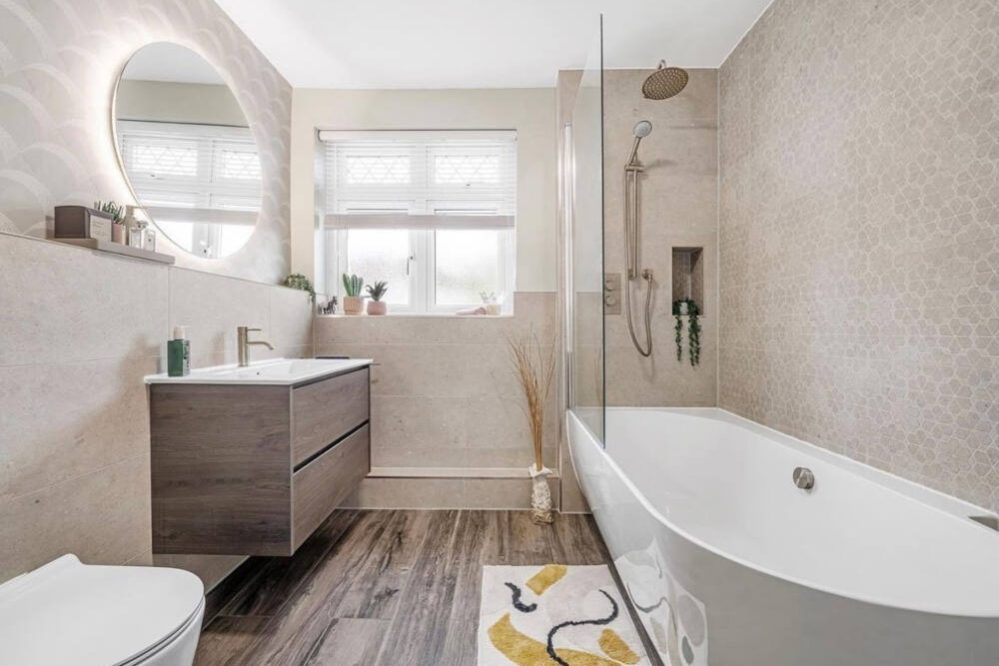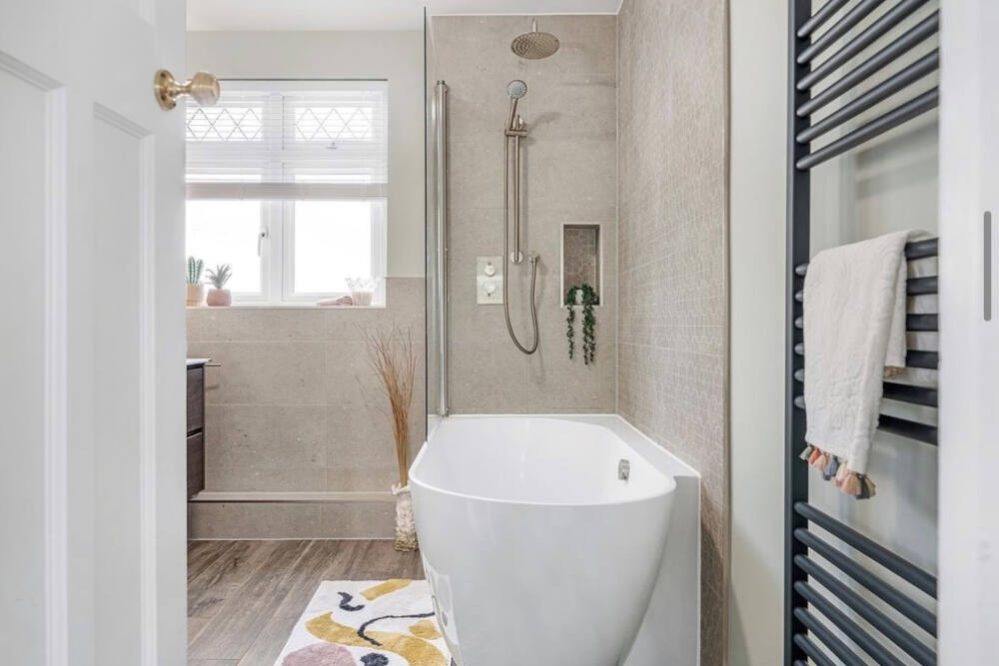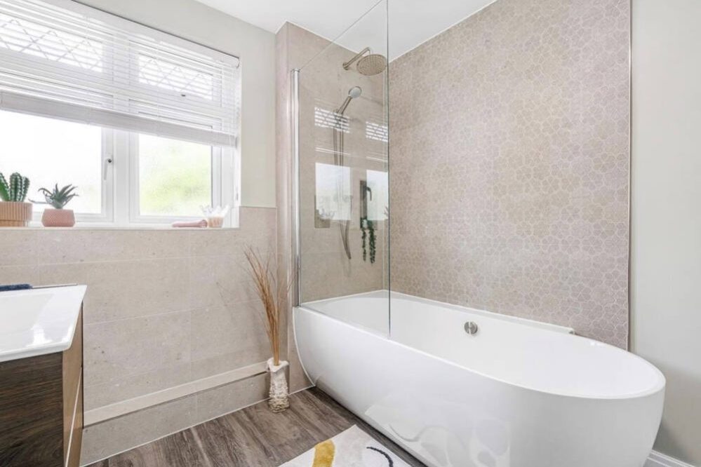 This stunning bathroom combines a bath and shower together, yet still captures a modern free standing look so it is practical yet beautiful to look at.