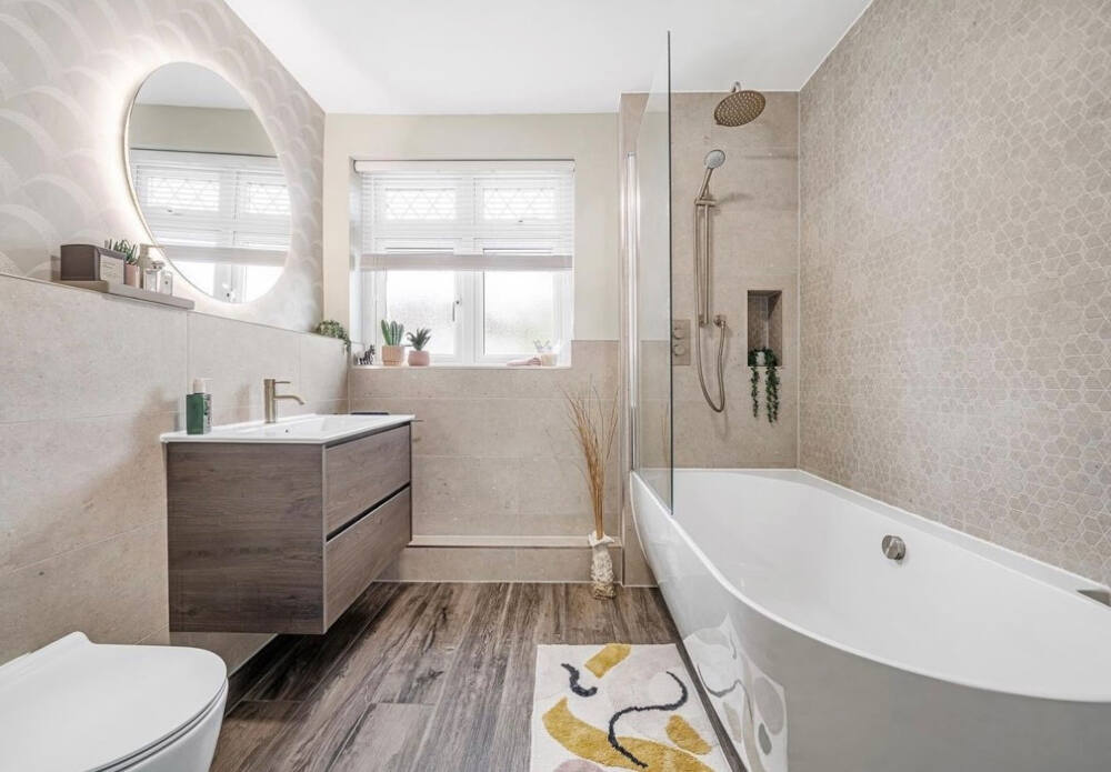 This stunning bathroom combines a bath and shower together, yet still captures a modern free standing look so it is practical yet beautiful to look at.